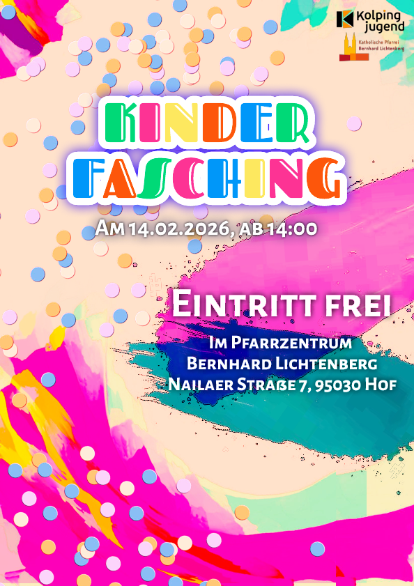 Am 14. Februar 2026 laden wir alle Kinder und ihre Familien ab 14 Uhr herzlich ins Pfarrzentrum Bernhard Lichtenberg (Nailaer Straße 7, 95030 Hof) ein, um gemeinsam einen bunten und fröhlichen Nachmittag zu verbringen.